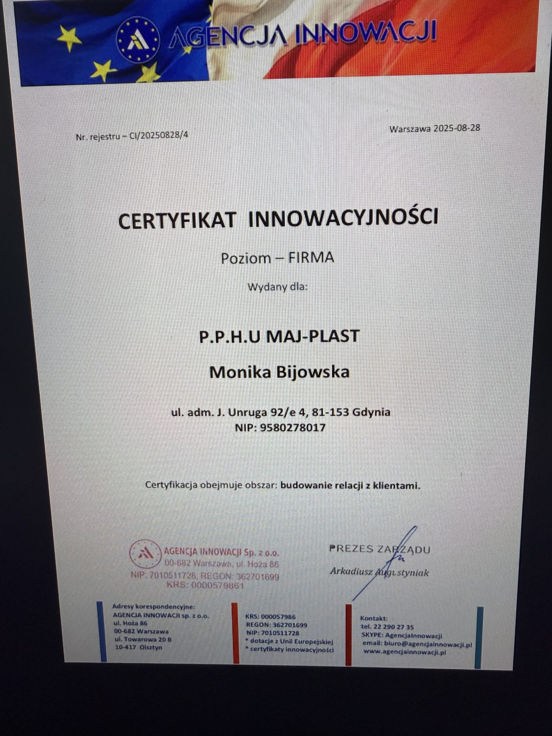 Z dumą informujemy, że firma PPHU Maj-Plast Monika Bijowska otrzymała Certyfikat Innowacyjności na poziomie „Firma”, przyznany przez Agencję Innowacji. Certyfikacja obejmuje obszar budowania relacji z klientami, co oznacza, że nasze podejście do współpracy, komunikacji oraz realizacji projektów spełnia wysokie standardy nowoczesnego biznesu. Dla nas innowacyjność to nie tylko nowe technologie. To również sposób myślenia:– otwartość na nowe rozwiązania,– rozwój kompetencji,– partnerska współpraca z klientami i dostawcami. To wyróżnienie jest dla nas potwierdzeniem, że kierunek rozwoju Maj-Plast jest właściwy – a jednocześnie motywacją do dalszego wdrażania nowych rozwiązań w przetwórstwie tworzyw sztucznych i produkcji przemysłowej.